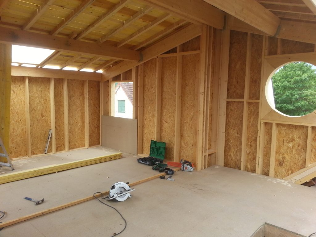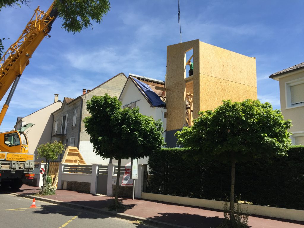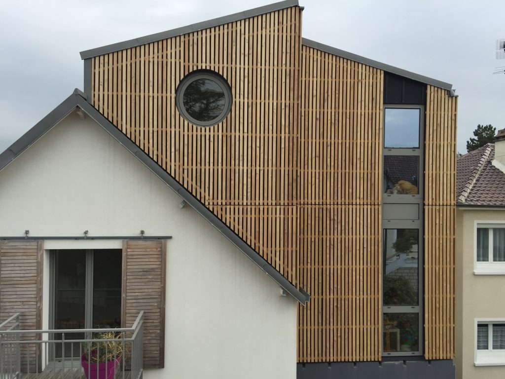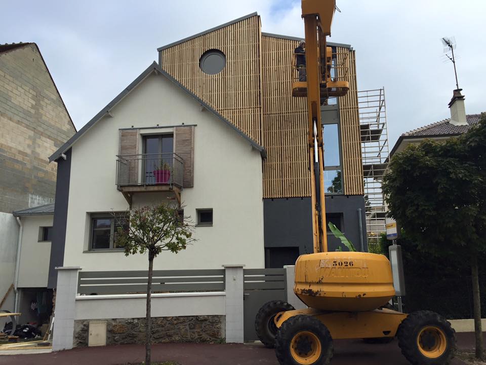 Surélévation d’un pavillon Pavillon à Antony Fourniture et pose : . Ossature bois. Charpente bois. Plancher bois. Couverture zinc à joint debout. Bardage mélèze à claire voix